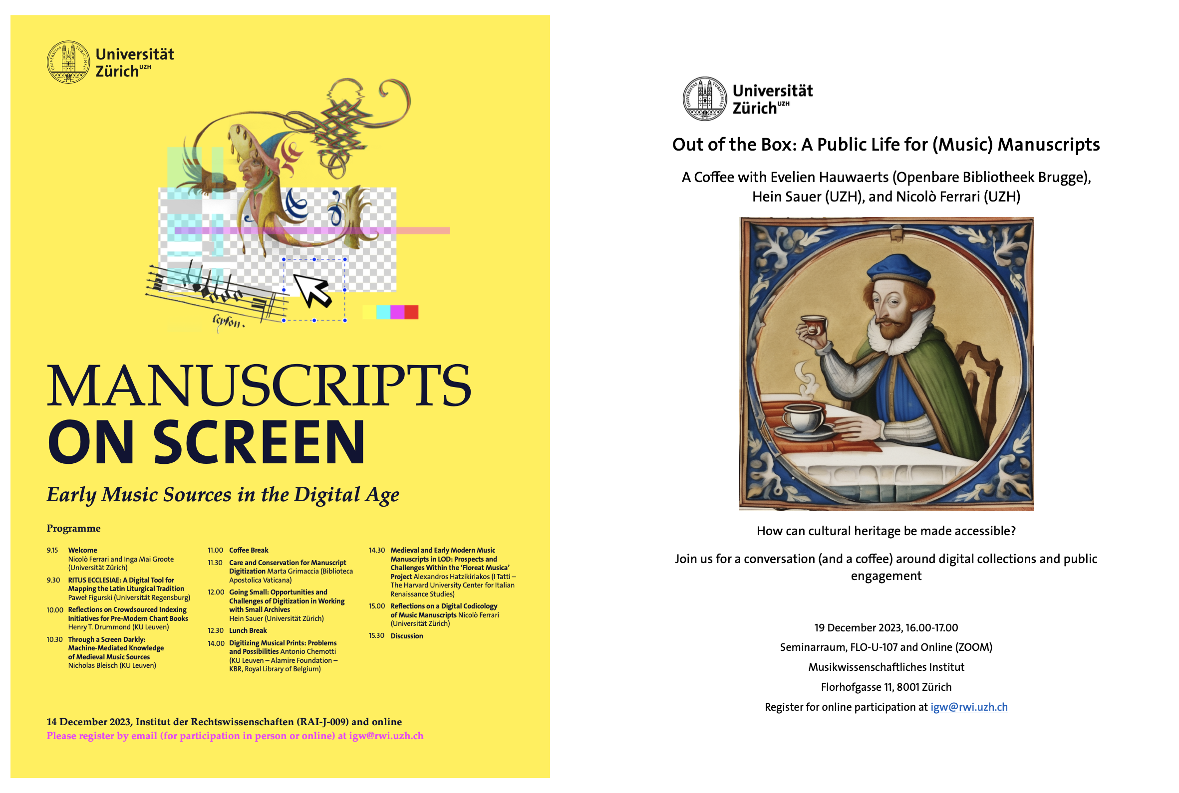Er veranstaltet am 14.12.2023, 9.15–16.00 Uhr, den internationalen Workshop "Manuscripts on screen: Early music sources in the digital age" (Programm) und am 19.12.2023, 16.00–17.00 Uhr, die Diskussionsrunde "Out of the box: a public life for (music) manuscripts". Informationen zum genauen Programm finden Sie anbei.